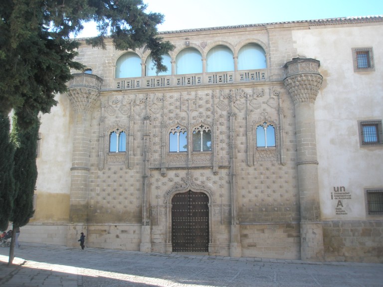 Entre los edificios más destacados podemos encontrar la antigua carnicería, construida en 1547 y que a mediados del siglo XX ,fue completamente desmontado y trasladado, piedra a piedra, hasta la Plaza del Pópulo. La antigua universidad, que comenzó su andadura en la primera mitad del Siglo XVI y el Palacio de Jabalquinto, que es actualmente Sede Internacional de la Universidad Antonio Machado. La construcción data de finales del siglo XV, constituye uno de los máximos exponentes del estilo gótico isabelino, estilo que se manifiesta, principalmente, en la fachada de los edificios. La de este palacio se encuentra profusamente decorada con puntas de diamante, mocárabes, lazos, escudos, etc. También se pueden apreciar influencias mudéjares.